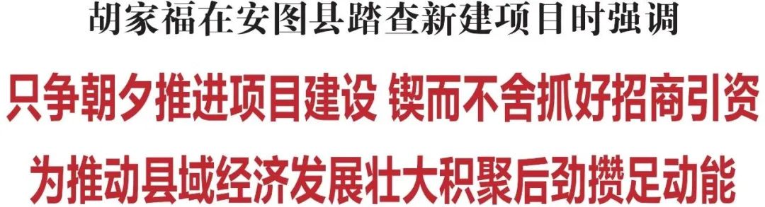6月19日,省委常委、州委书记胡家福到安图县实地踏查新建项目建设情况。他强调,要深入贯彻习近平总书记在新时代推动东北全面振兴座谈会上的重要讲话精神,牢固树立“项目为王”的理念,坚持“深度关联”的思维,只争朝夕推进项目建设,锲而不舍抓好招商引资,加快传统产业转型升级、新兴产业培育壮大,为推动县域经济发展壮大积聚后劲、攒足动能。