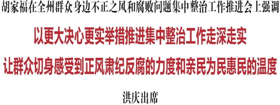 胡家福指出,开展群众身边不正之风和腐败问题集中整治,是习近平总书记亲自点题、中央纪委国家监委安排部署的一项重大政治任务,是纵深推进全面从严治党、巩固党的执政根基的重要举措。发生在群众身边的不正之风和腐败问题,虽然涉及金额不大、干部层级不高,但直接侵害群众切身利益,啃食群众的获得感、幸福感和安全感,人民群众深恶痛绝。各县市、各部门要深刻认识开展群众身边不正之风和腐败问题集中整治的重要意义,切实增强狠抓集中整治工作的行动自觉,将集中整治工作与党纪学习教育、“狠抓落实年”、“基层减负年”等工作统筹摆布、有机结合,集中时间、集中精力、集中力量查办一批有影响有分量的“蝇贪蚁腐”,让各族群众切身感受到党中央和习近平总书记的关心关爱就在身边、正风反腐就在身边、公平正义就在身边。