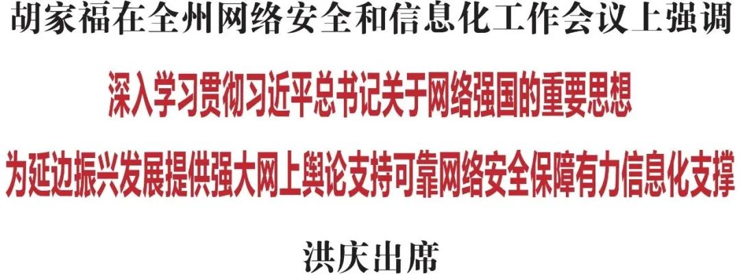 胡家福指出,党的十八大以来,以习近平同志为核心的党中央高度重视互联网、发展互联网、治理互联网,习近平总书记从信息化发展大势和国内国际大局出发,就网信工作提出了一系列具有原创性的新理念新思想新战略,深刻阐释了网信事业发展的一系列重大理论和实践问题,把党对网信工作的规律性认识提升到全新高度,形成了习近平总书记关于网络强国的重要思想,擘画了建设网络强国的宏伟蓝图。全州各级党委、政府要坚持以习近平总书记关于网络强国的重要思想为引领,贯彻落实习近平总书记关于网络安全和信息化工作的重要指示精神,按照全国网络安全和信息化工作会议、全省网络安全和信息化工作会议的部署要求,坚持以推动经济高质量发展为主题、以铸牢中华民族共同体意识为主线,坚持正能量是总要求、管得住是硬道理、用得好是真本事,牢牢把握“举旗帜聚民心、防风险保安全、强治理惠民生、增动能促发展、谋合作图共赢”的使命任务,以更加强大的网上宣传引导塑造更加昂扬的主流思想舆论,以更加高效的网络综合治理营造更加清朗的网络空间,以更加有力的信息化驱动引领更高水平的数字延边建设,为延边振兴发展提供强大网上舆论支持、可靠网络安全保障和有力信息化支撑。