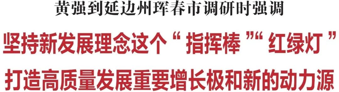 7月3日,省委书记黄强到延边州珲春市调研。他强调,要始终牢记习近平总书记殷殷嘱托,坚持新发展理念这个“指挥棒”“红绿灯”,善于发挥优势,利用资源禀赋,努力打造高质量发展重要增长极和新的动力源。