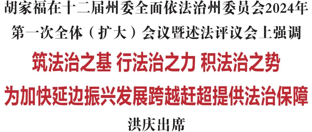 胡家福指出,党的十八大以来,以习近平同志为核心的党中央高度重视法治建设,从2014年把全面依法治国纳入“四个全面”战略布局统筹推进,到党的十九届三中全会组建中央全面依法治国委员会,再到党的二十大报告第一次以专章部署全面依法治国工作,充分彰显了全面依法治国、法治中国建设在党和国家工作全局中的地位更加突出、作用更加重大。各级党委、政府和各级领导干部要深入学习贯彻习近平法治思想,坚持依法治州、依法执政、依法行政共同推进,法治延边、法治政府、法治社会一体建设,统筹推进科学立法、严格执法、公正司法、全民守法,以良好法治保障高质量发展、守护高品质生活、护航高水平安全。