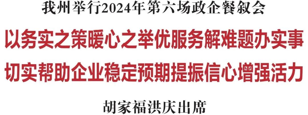 7月28日,延边州2024年第六场政企餐叙会在延吉举行。省委常委、州委书记胡家福,州委副书记、州长洪庆与企业家代表们面对面交流,详细了解企业和行业发展情况,研究解决企业发展面临难题,进一步激发广大企业家干事创业的奋斗激情,汇聚起政企同心、共促发展的强大合力。