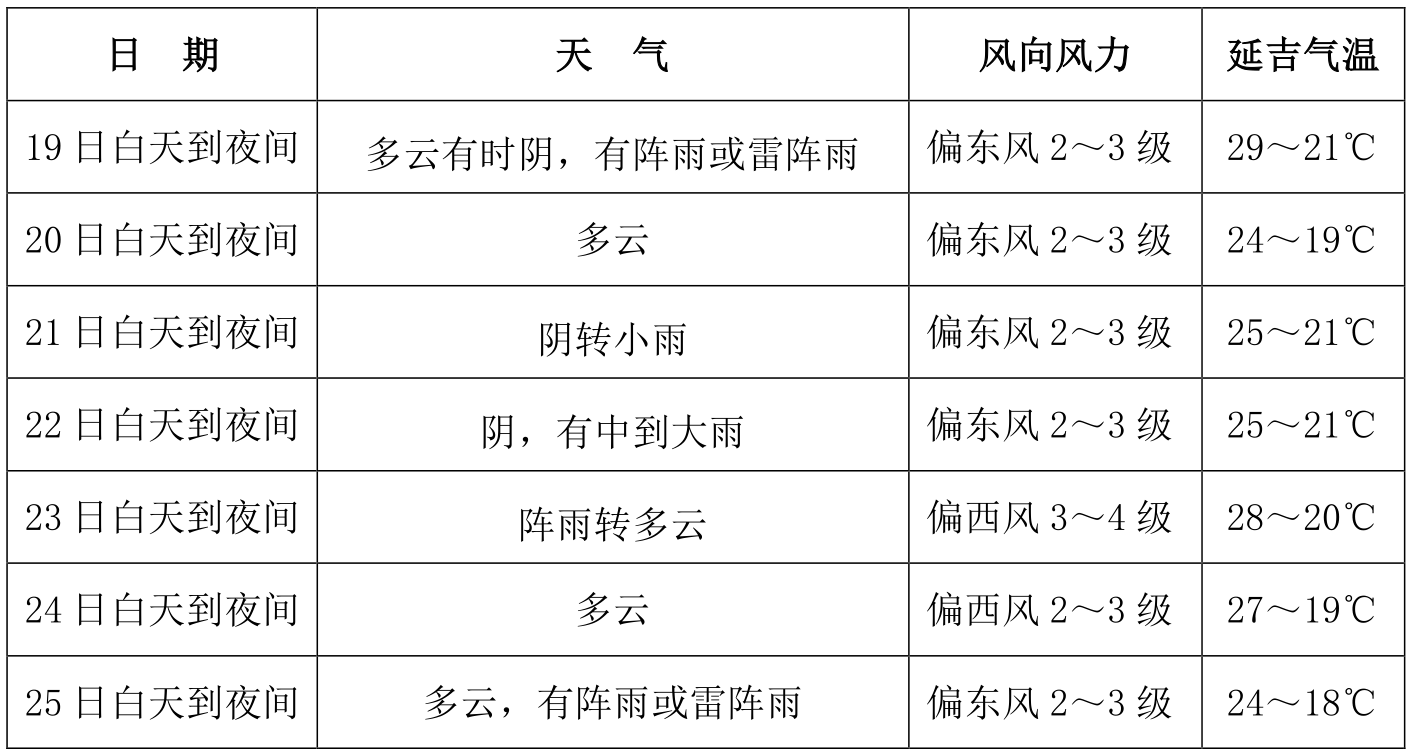 预计全州平均气温为22.5℃左右,与常年同期相比高2.2℃左右,本周气温起伏较大,20日开始气温下降,20日-22日白天最高气温一般为23℃~26℃,23日气温回升,25日气温再次下降;全州平均降水量为30毫米~50毫米,与常年同期相比多15毫米左右。