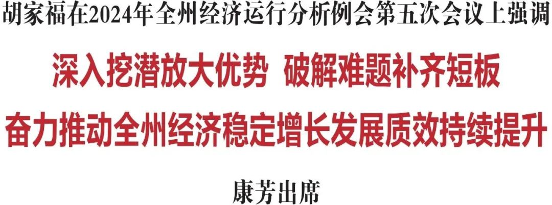 胡家福指出,今年以来,全州上下聚焦跨越赶超目标任务,迎难而上、积极作为,千方百计拼经济、谋发展,全力以赴补短板、强弱项,经济运行呈现总体平稳、稳中有进的良好发展态势。但必须清醒地看到,当前经济运行中仍存在部分项目建设推进较慢、规模以上工业承压较大等隐忧,必须深入剖析问题成因,对症下药精准施策,着力解决影响和制约稳增长的突出问题,为完成全年目标任务奠定坚实基础。