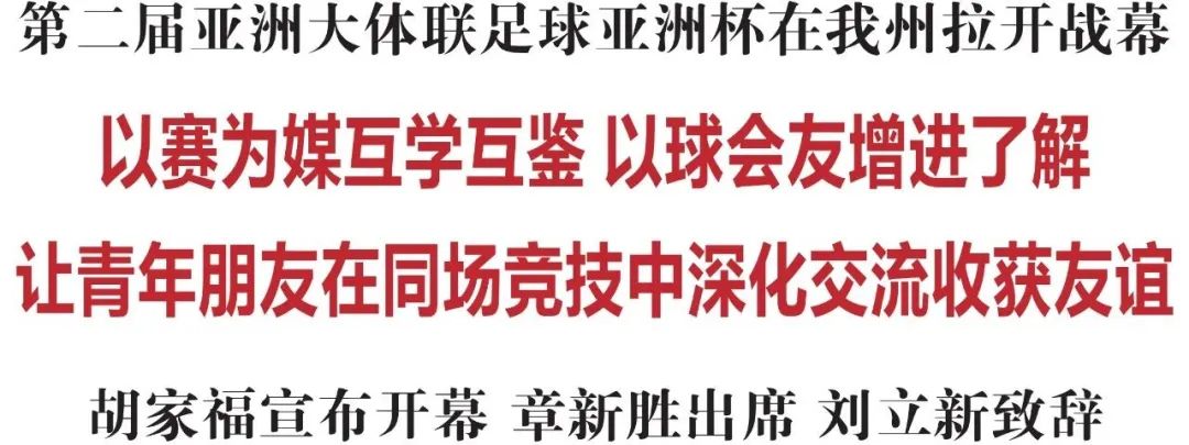 驰骋绿茵赛场,展现青春风采。9月17日,第二届亚洲大体联足球亚洲杯在我州的龙井市海兰江足球文化产业园开幕。省委常委、州委书记胡家福出席开幕式并宣布本届比赛开幕。教育部原副部长、亚洲大学生体育联合会荣誉主席章新胜出席开幕式。亚洲大学生体育联合会主席、中国学生体育联合会主席兼秘书长刘立新出席开幕式并致辞。