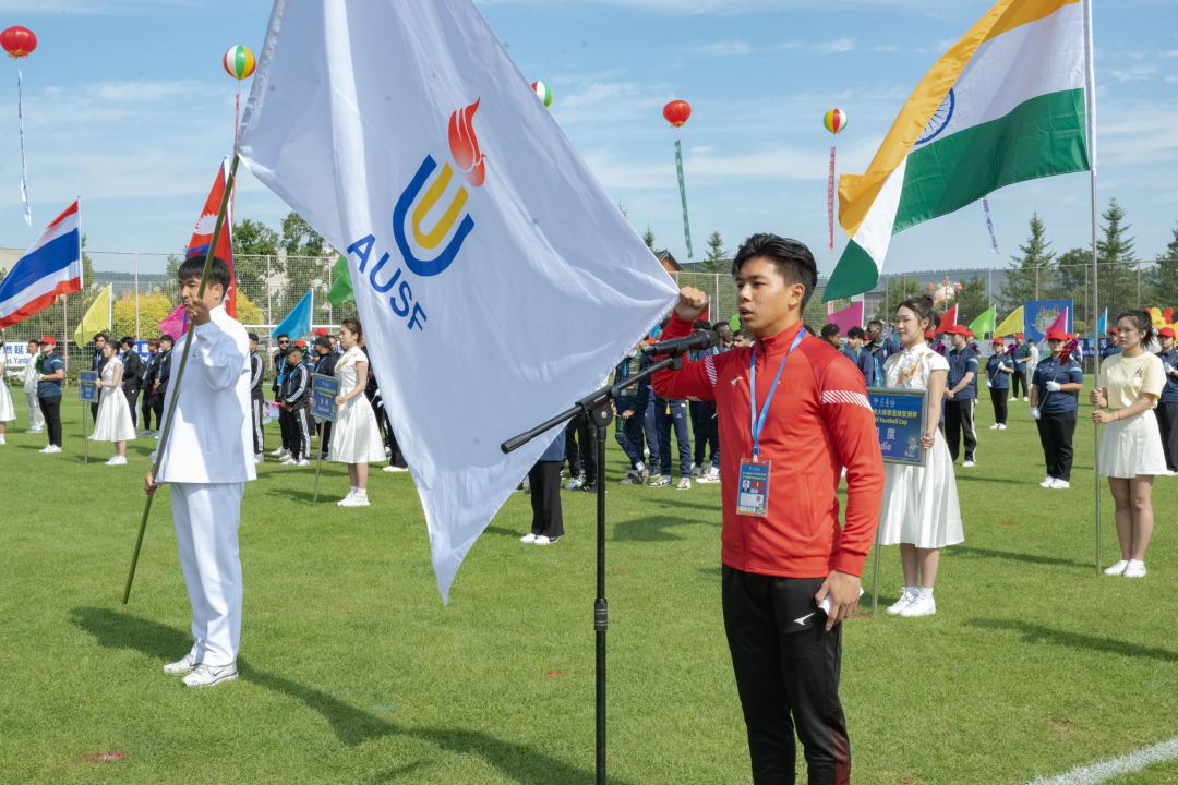 9时27分,开幕式迎来激动人心的一刻。胡家福用洪亮的声音宣布:“第二届亚洲大体联足球亚洲杯开幕!”顿时,全场沸腾起来,掌声、欢呼声经久不息。之后,伴随着亚洲大学生体育联合会会歌的旋律,亚洲大学生体育联合会会旗徐徐升起。运动员、裁判员代表分别进行宣誓。