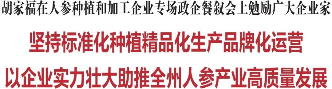 胡家福指出,人参是吉林省的特色优势资源,人参产业是极具发展潜力的富民产业。省委、省政府高度重视、大力支持人参产业,下定决心推动人参产业高质量发展,加快把这一宝贵资源优势转化为产业发展优势,这为我们发展人参产业带来了难得机遇。延边地处长白山腹地,生态环境优良,土壤气候适宜,在发展人参产业方面具有得天独厚的优势和条件。当前,我州正主动融入全省人参产业发展战略,立足区位优势、资源禀赋和产业基础,稳定种植业、集聚加工业、培育服务业,推动一二三产业深度融合,努力打造高端、高值、高新的现代化人参产业体系,持续擦亮叫响“中国人参看吉林,吉林人参看延边”这块“烫金招牌”。今天在座的各位企业家,都是州内人参种植和加工领域的佼佼者,拥有敏锐的商业头脑和丰富的行业经验。希望各位企业家坚守做大做强的雄心、创新求变的决心、产品至上的匠心,更好发挥示范引领作用,在人参种植、精深加工、市场开拓等方面持续发力,推动企业发展再提速、实力再壮大。要坚持质量为先,始终把产品质量作为企业发展的生命线,在人参种植上应用标准化种植技术,进一步加强人参产品质量检验检测,加快实施“一参一码”数字化追溯,不断提高企业绿色种植、规范化管理水平,努力实现人参品质与产量双提升,让绿色有机成为延边人参的鲜明特质。要做好精深加工,坚持把技术研发和产品创新摆在企业发展的重要位置,持续加大研发投入力度,注重嫁接科研院所技术成果,加快人参在食品、保健品、药品、化妆品、生物制药等领域的多元化开发利用,推出更多适应市场需求的高技术人参产品,持续提高人参产业效益和产品附加值,推动人参产业链向高端延伸。要创新营销手段,主动适应消费群体个性化、差异化的消费需求,积极布局线上渠道、持续开拓线下市场,大力发展直播带货、跨境电商等新业态新模式,推动各类人参产品进景区、进宾馆、进车站,形成线上流量带动线下销售、线下口碑反哺线上流量的“双向奔赴”,进一步提升人参产品的市场占有率,助力企业在激烈行业竞争中破圈突围。