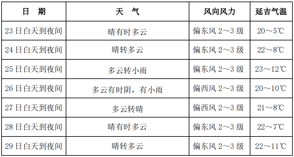 预计全州平均气温为14.0℃左右,比常年同期高1.5℃, 本周气温小幅波动且早晚气温较低;全州平均降水量为4毫米~8毫米,比常年同期少4毫米左右。预计25日-26日有小雨。