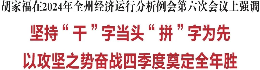9月26日,省委常委、州委书记胡家福主持召开2024年全州经济运行分析例会第六次会议。他强调,要深入贯彻习近平总书记在新时代推动东北全面振兴座谈会上的重要讲话和党的二十届三中全会精神,咬定全年既定目标,坚持“干”字当头、“拼”字为先,以攻坚之势奋战四季度、奠定全年胜。