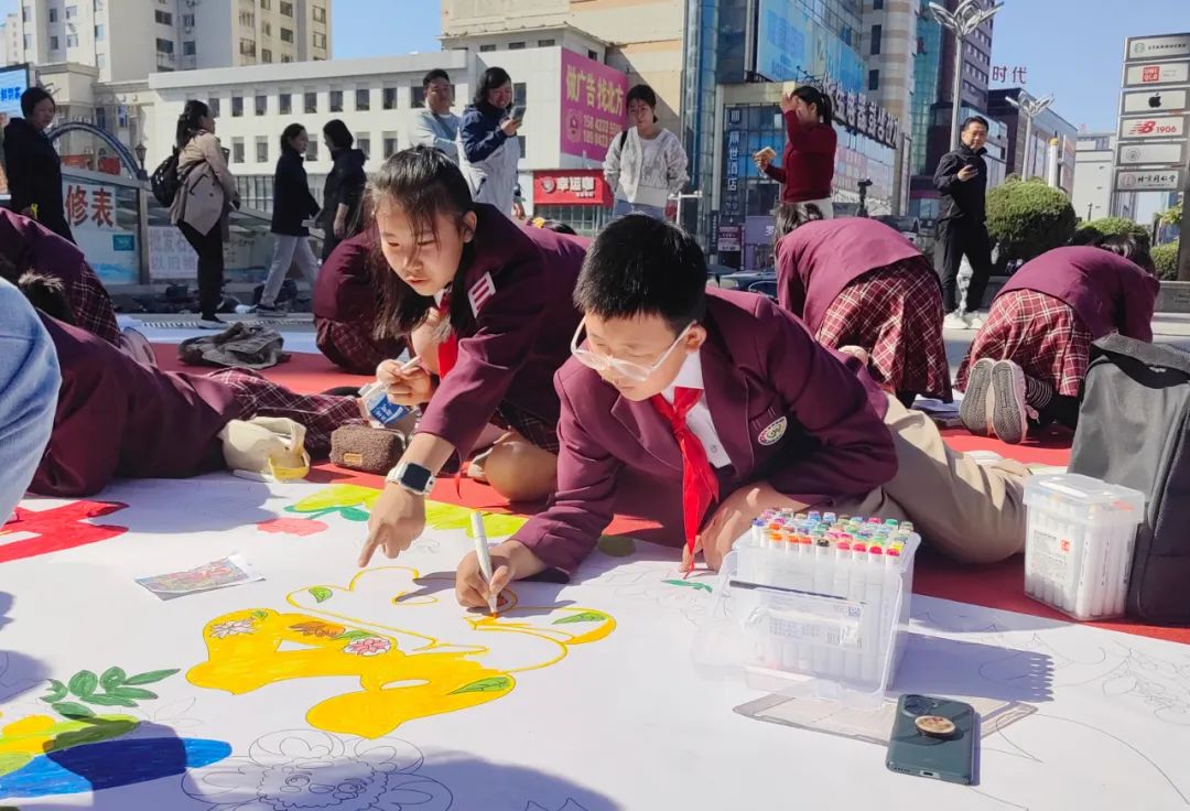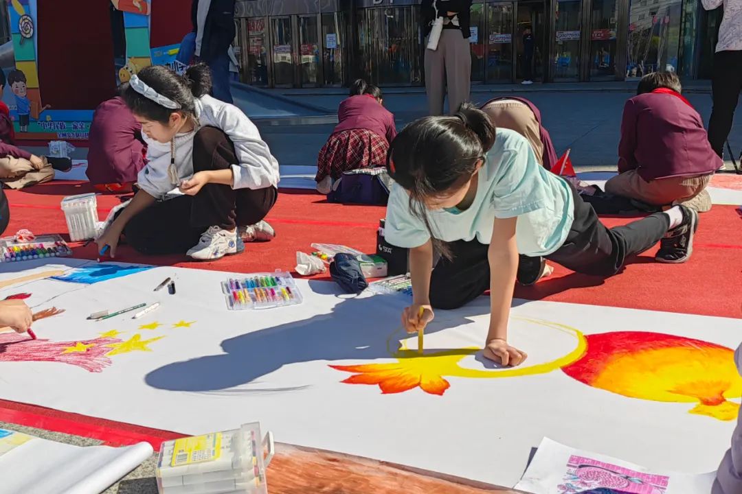 活动现场,少先队员们蹲坐在百米画布前,或低头沉思、构思画作,或相互交流、分享心得。画笔在他们灵巧的手指间跳跃,一个个充满童趣和想象力的绘画作品逐渐成型。