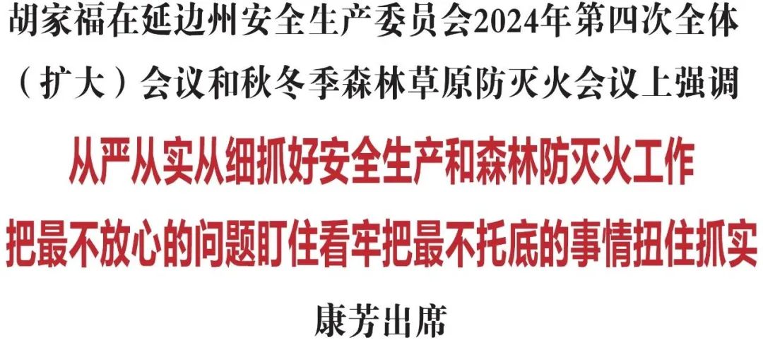 9月30日,省委常委、州委书记胡家福主持召开延边州安全生产委员会2024年第四次全体(扩大)会议和秋冬季森林草原防灭火会议。他强调,要深入贯彻习近平总书记关于安全生产和森林草原防灭火的重要指示精神,按照全国、全省安全生产和秋冬季森林草原防灭火会议部署,坚持人民至上、生命至上,从严从实从细抓好安全生产和森林防灭火工作,把最不放心的问题盯住看牢,把最不托底的事情扭住抓实,坚决扛起促一方发展、保一方平安的重大政治责任。州政协主席康芳出席会议。
