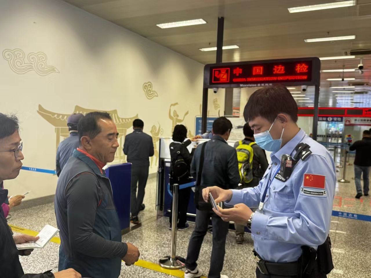 “节日期间,我们坚持做好查验前的准备和保障工作,在旅客下机进入候检区前,台外民警会在入境缓冲区内及时摸排旅客人员构成,科学区分个人、团体,中国籍、外国籍,做到分类引导、分区候检。针对口岸外国籍人员团组比重大的实际,我们全面统筹管,选派外语骨干民警担任台外引导员,最大限度提升口岸通关效率,缩短人员通关时间。”执勤一队民警麻馨允介绍道。