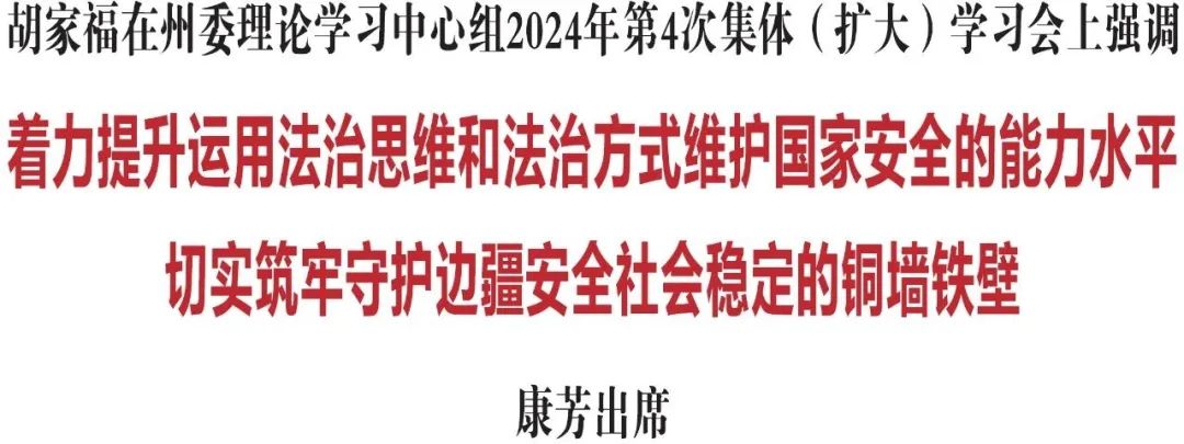 胡家福强调,国家安全法治体系建设是一项庞大复杂的系统工程,学习好、掌握好、运用好国家安全法律法规是做好国家安全工作的重要前提。各级党委(党组)要坚持把学习国家安全法律法规作为推进国家安全法治体系建设的重要任务,把握重点学、联系实际学,切实做到学以致用、用以促学,着力提升运用法治思维和法治方式防范化解国家安全风险、维护国家安全的能力水平。领导干部要带头学,州委常委和州级领导要学深悟透习近平总书记关于总体国家安全观的重要论述,系统学习以国家安全法为核心的法律法规,学懂弄通蕴含其中的国家安全战略考量,不断提升统筹发展和安全的能力。各级各部门要系统学,坚持把学习国家安全法律法规融入日常、抓在经常,深入理解、准确掌握处理国家安全问题的科学方法,更好地运用国家安全法律法规指导实践、推动工作。要扎实开展国家安全宣传教育,以典型案例形式为社会确立是非准则、划出法律底线,教育引导广大干部群众主动关心国家安全、自觉维护国家利益,切实筑牢国家安全的人民防线,凝聚起维护国家安全的强大力量。