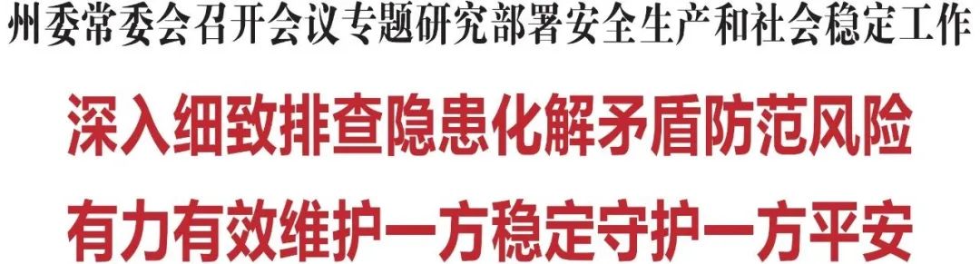 11月25日,州委常委会召开会议,传达学习贯彻习近平总书记对广东珠海市驾车冲撞行人案件作出的重要指示和李强总理批示精神,听取关于全州安全生产工作情况汇报,专题研究部署我州安全生产和社会稳定工作。省委常委、州委书记胡家福主持会议并讲话。