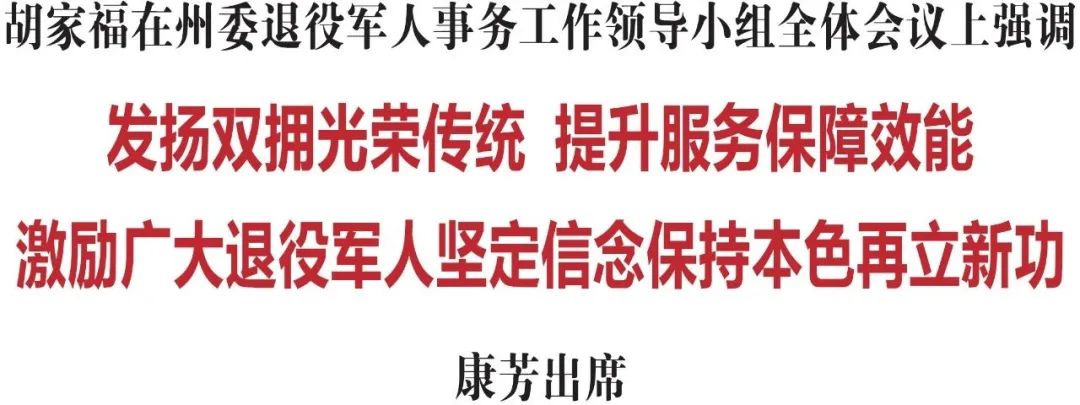 胡家福强调,各级党委要把退役军人工作摆上重要议事日程,坚持“四级书记”带头抓退役军人工作,统筹推进组织管理体系、工作运行体系、政策制度体系建设,进一步健全完善党委领导、政府负责、退役军人事务部门牵头协调、军地和相关部门支持配合、全社会共同参与的工作格局。州委退役军人事务工作领导小组要切实履行把方向、抓统筹、谋大局、促落实职责,着力解决跨军地、跨部门、跨领域重点难点问题。领导小组办公室要发挥牵头抓总作用,积极组织开展重大问题研究部署,推动各项工作取得实效。各成员单位要牢固树立“一盘棋”思想,主动履职尽责,强化协调联动,做到组织领导到位、政策交接到位、投入保障到位。