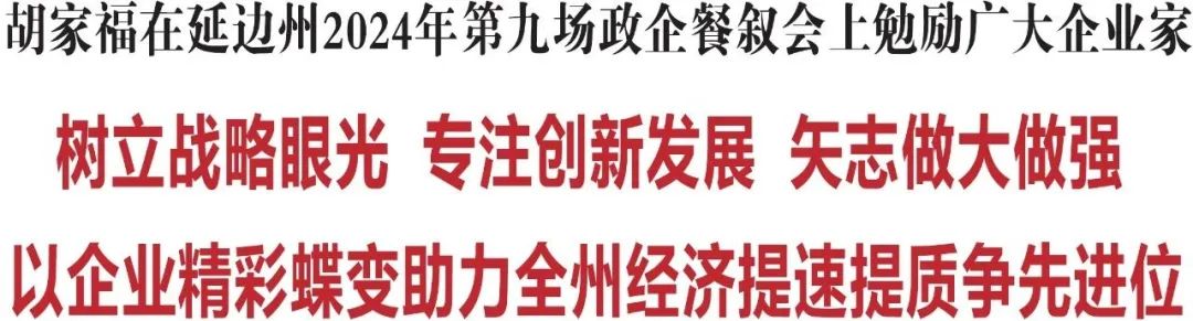 11月26日,我州举行2024年第九场政企餐叙会,邀请今年已入规和拟入规工业企业代表相聚一堂,详细了解企业经营现状和发展需求,研究解决企业面临的问题和困难,为广大企业家提振信心、加油鼓劲。省委常委、州委书记胡家福出席餐叙会,代表州委、州政府向长期以来关心支持延边振兴发展的广大企业家表示感谢,并勉励大家树立战略眼光,专注创新发展,矢志做大做强,以企业精彩蝶变助力全州经济稳中提质、争先进位。