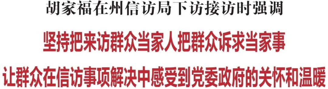 11月27日,省委常委、州委书记胡家福到州信访局接待群众来访,现场协调推动信访问题解决。他强调,要深入贯彻落实习近平总书记关于加强和改进人民信访工作的重要思想,真正扛起为民解难、为党分忧的重大政治责任,坚持把来访群众当家人、群众诉求当家事,用心用情回应群众期盼,真心真意为百姓排忧解难,让群众在信访事项解决中真切感受到党委、政府的关怀和温暖。
