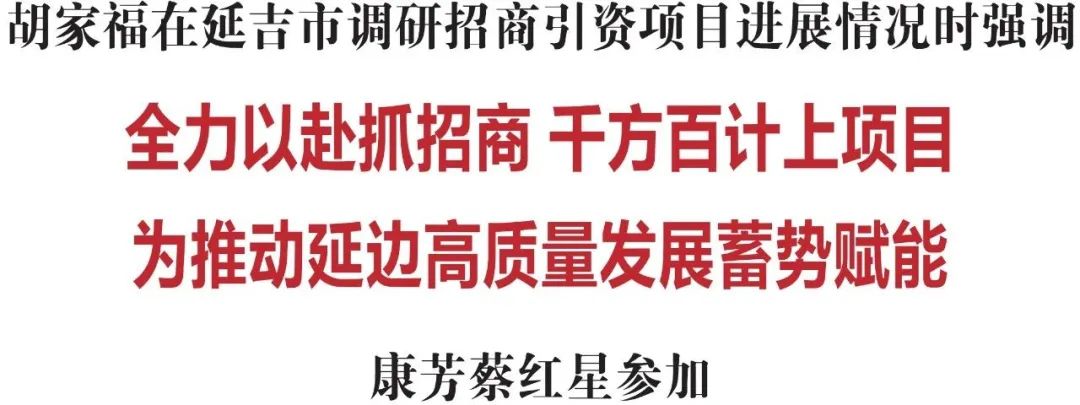 调研中,胡家福强调,项目建设是拉动经济增长的重要引擎,是增强发展后劲的“源头活水”。只有高质量抓好项目建设,才能不断壮大发展新动能、增添发展新优势,加快延边跨越赶超才能更有底气、更有依托。延吉市作为首府城市,地位举足轻重、作用至关重要,必须在全州发展大局中打头阵、挑重担、作示范。要牢固树立“抓项目就是抓发展、谋项目就是谋未来”理念,坚持实体经济为主、制造业当家,瞄准“双过百、双过半”目标,全力以赴抓好招商引资和项目建设工作,为推动延边高质量发展、可持续振兴提供更加坚实支撑、积蓄更强动能。要聚精会神抓好项目建设,大力推进长图铁路延吉站迁建、医美小镇等重大项目,加快1978文创园、1952商业街、敖东新药开发等项目建设步伐,扎实做好戴纳微重力实验室、全芯微集成电路封测等项目冬季施工,力促项目早出形象、早出成效。要精心谋划明年项目,紧紧抓住现有存量政策及一揽子增量政策机遇,紧盯超长期特别国债、专项债、中央预算内资金的政策导向、支持领域、具体投向,找准与本地发展的契合点、切入点,谋划包装一批打基础、利长远、增后劲的大项目、好项目,切实把政策红利转化为推动县域经济发展的强大动力。要锲而不舍开展招商引资,立足资源禀赋、区位优势和产业基础,依托高新区、空港区等园区平台,用好延吉—长白重点开发开放试验区赋予的相关政策,系统梳理产业链的短板弱项和空白领域,持续招引一批优质企业和产业项目,加快催生更多新的增长点、支撑点。党政主要负责同志要带头研究产业、带头招商引资、带头破解难题,“四大班子”成员要胸中有全局、手上有项目,积极参与招商引资、招引落地企业项目,各职能部门、开发区要专心致志抓招商、集中精力谋项目,实实在在引进落地一批重大项目,为产业转型升级、经济稳定增长注入新动力。