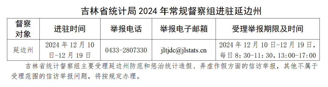 为切实防治统计造假、提升统计数据质量,经省委、省政府授权,吉林省统计局2024年常规统计督察组近日进驻延边州开展统计督察工作,并于12月10日与州委、州政府进行对接沟通。督察组组长、吉林省统计局党组书记、局长林梅通报统计督察事宜,提出工作要求。延边州委副书记盛效儒主持对接沟通并讲话,州委常委、副州长刘新钢出席。