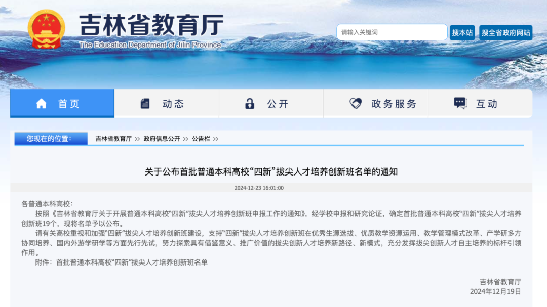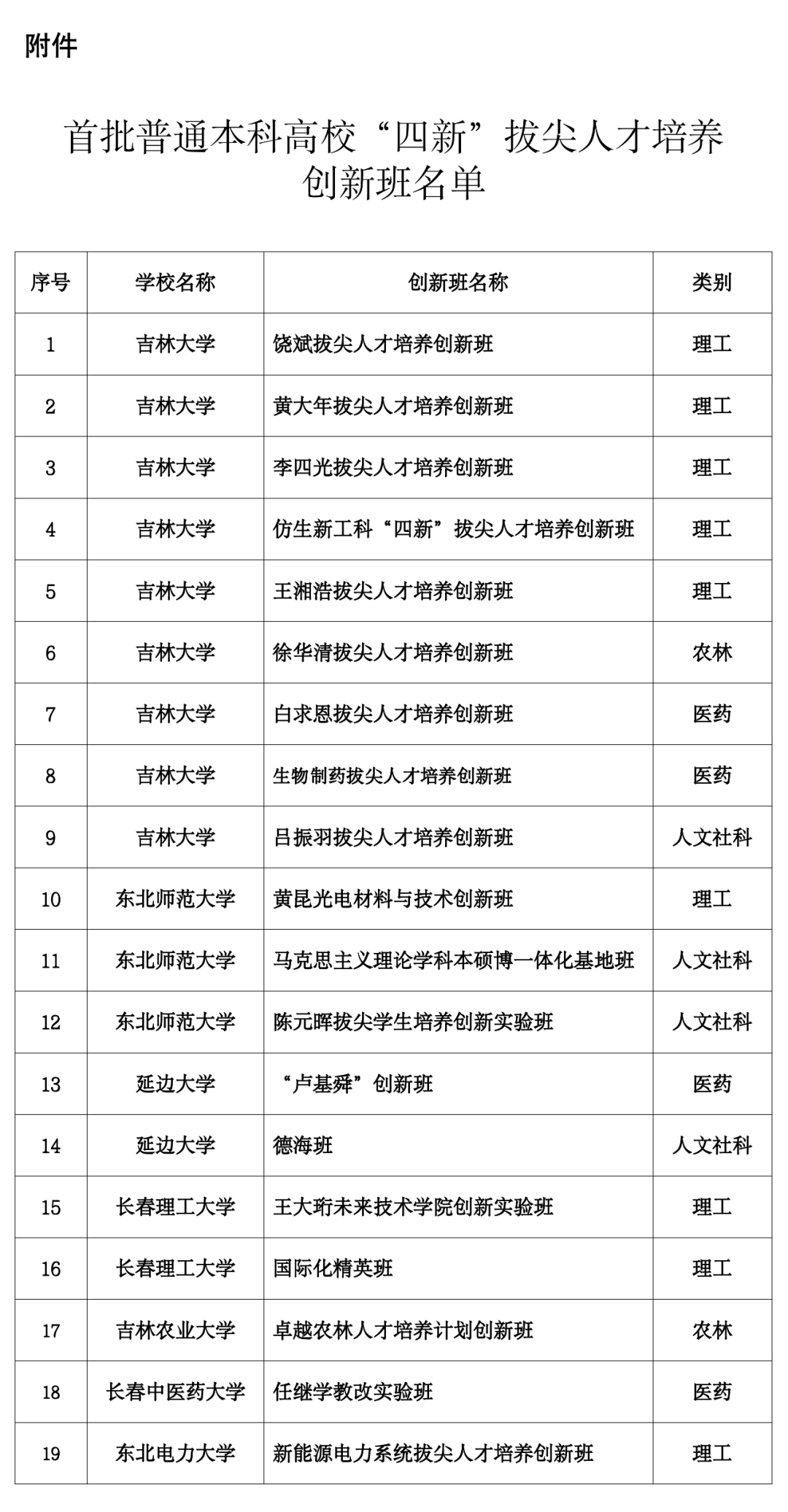 按照《吉林省教育厅关于开展普通本科高校“四新”拔尖人才培养创新班申报工作的通知》,经学校申报和研究论证,确定首批普通本科高校“四新”拔尖人才培养创新班19个,现将名单予以公布。