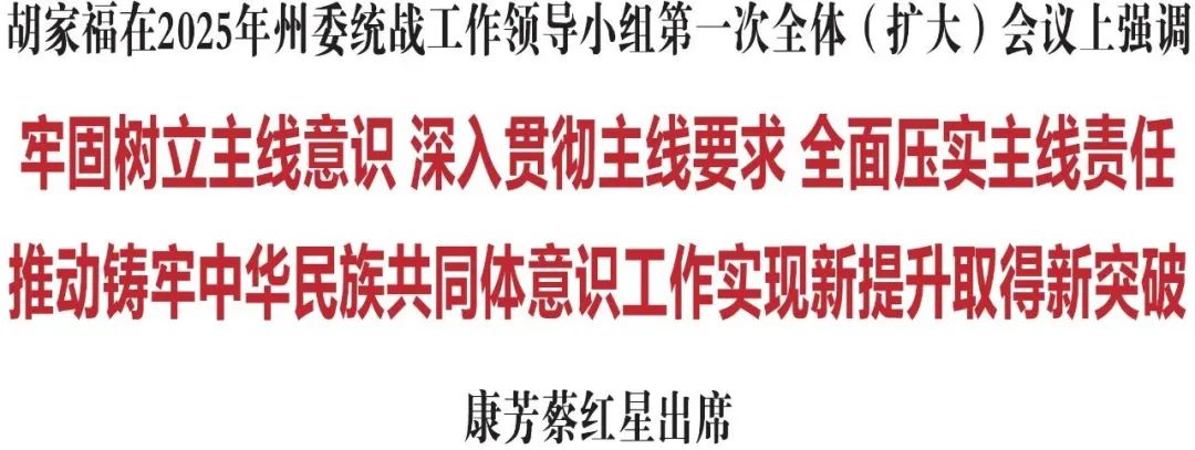 1月2日,元旦节后上班第一天,省委常委、州委书记、州委统战工作领导小组组长胡家福主持召开2025年州委统战工作领导小组第一次全体(扩大)会议。他强调,要深入贯彻习近平总书记关于加强和改进民族工作的重要思想、关于铸牢中华民族共同体意识的重要论述、关于加强边疆治理的重要论述,牢固树立主线意识,深入贯彻主线要求, 全面压实主线责任,推动铸牢中华民族共同体意识工作实现新提升、取得新突破。州政协主席康芳、州人大常委会党组书记蔡红星出席会议。