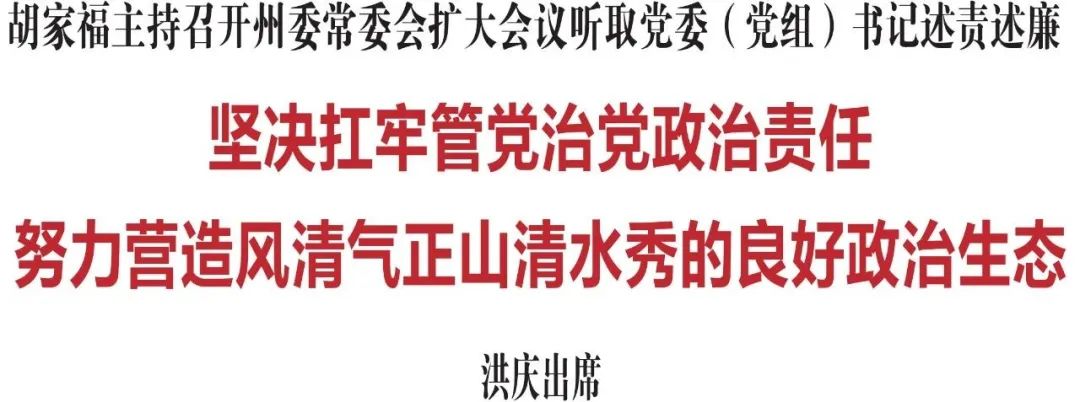 1月18日,省委常委、州委书记胡家福主持召开州委常委会扩大会议,听取各县(市)和部分州直部门单位党委(党组)书记述责述廉。他强调,要深入学习贯彻习近平总书记关于党的自我革命的重要思想,坚决扛牢管党治党政治责任,努力营造风清气正、山清水秀的良好政治生态,为加快推动延边跨越赶超提供坚强政治保障。州委副书记、州长洪庆出席会议。