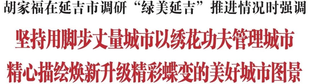 调研中,胡家福强调,“绿美延吉”行动实施两年多来,一大批有碍观瞻的城市“疮疤”得到有效治理,首府城市面貌发生明显变化、城市颜值显著提升。但必须清醒地看到,对照各族群众对美好生活的向往、外来旅游者对美好出游环境的期待,当前城市建设、治理工作中仍然存在一些突出问题。延吉市要进一步增强政治责任感和工作紧迫感,对标首府要求和首善标准,紧紧盯住薄弱环节、短板弱项,坚持从点滴细微处落笔着墨、精雕细琢,推动市容市貌和环境品质实现双提升。要加大整治力度,切实发挥好网格长、楼栋长、单元长作用,定期对辖区内主次干道、背街小巷、空置地块等点位开展排查,加大对占道经营、乱堆乱放等违规行为的整治力度,加强公共绿地、环境卫生、停车秩序等方面管理,以注重“角角落落”、突出“时时刻刻”的工作成效,着力打造优美整洁、规范有序的人居环境。要加强宣传引导,积极动员广大群众自觉遵守城市管理规定,切实履行好“门前三包”等社会责任,依托12345服务热线、“云吹哨”等平台及时上报道路破损、私搭乱建、残垣断壁等问题,群策群力抓好人居环境整治提升。要强化考核问效,坚持把城市精细化治理作为干部考核评价的重要标尺,对表现突出、成效显著、群众反响良好的给予通报表扬,对敷衍塞责、落实不力、造成恶劣影响的进行严肃问责,切实形成奖优惩劣的鲜明导向,激励各级干部更好地履职尽责、担当作为。