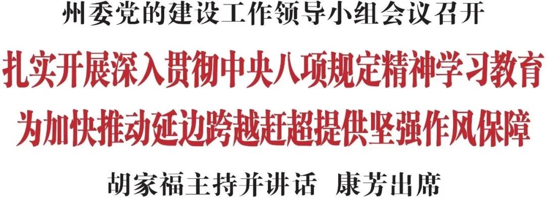 3月25日,州委党的建设工作领导小组会议在延吉召开,部署我州开展深入贯彻中央八项规定精神学习教育工作。省委常委、州委书记、州委党的建设工作领导小组组长胡家福主持会议并讲话。他强调,要深入学习贯彻习近平总书记重要讲话重要指示精神,按照中央和省委部署要求,扎实开展深入贯彻中央八项规定精神学习教育,为加快推动延边高质量发展、实现跨越赶超提供坚强作风保障。州政协主席康芳出席会议。