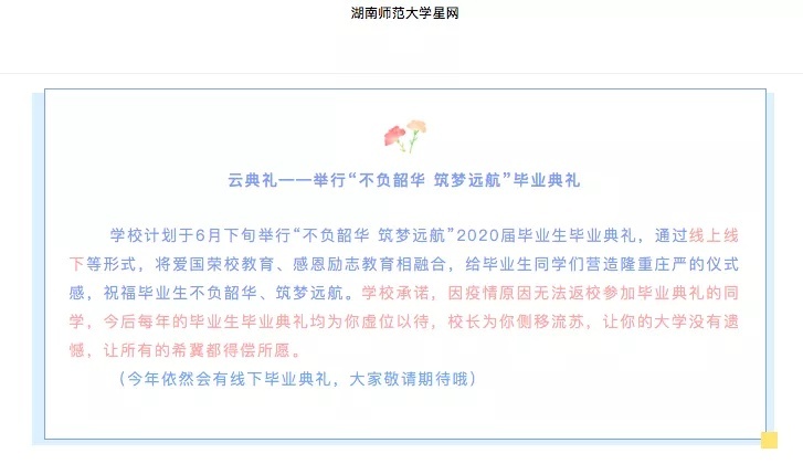 湖南师范大学承诺今年未返校的毕业生,可参加今后任何一年的毕业典礼!近日,湖南师范大学发布公告表示,“因疫情原因无法返校参加毕业典礼的同学,今后每年的毕业生毕业典礼均为你虚位以待”