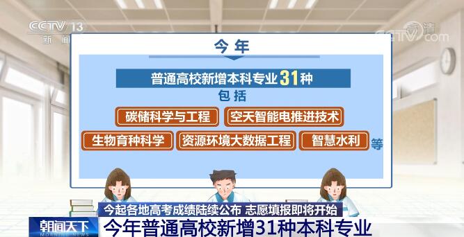 今年,普通高校新增本科专业31种,包括碳储科学与工程、空天智能电推进技术、生物育种科学、资源环境大数据工程、智慧水利等,这些专业都是在全国高校中首次设置,共有38所高校通过了新增专业审批