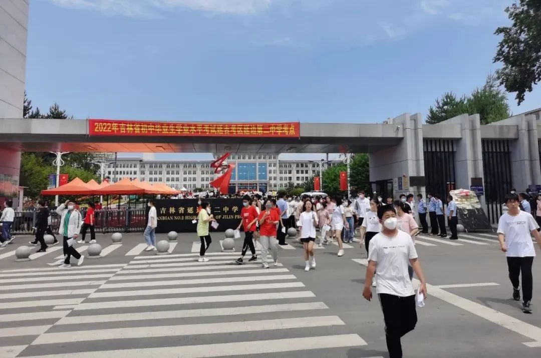当日,记者在延边二中考点外看到,许多家长和考生身穿红衣红裙,戴着“逢考必过”“旗开得胜”等字样口罩,现场一片“红色人海”
