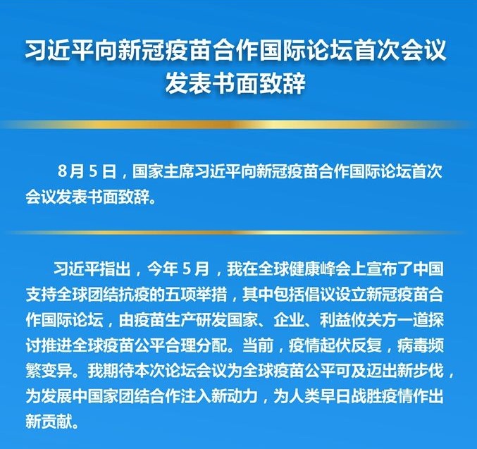 习近平向新冠疫苗合作国际论坛首次会议发表书面致辞