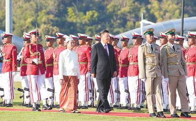 当地时间1月17日下午,国家主席习近平来到缅甸总统府,出席温敏总统为时隔19年再度访缅的中国国家元首举行的隆重欢迎仪式