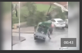 8月23日,广东中山。一男子在大风中双手抵住自己的货车,试图将车撑住。但因风力太大,货车被吹翻将男子压在车身下。坦洲镇政府宣传科工作人员称,该男子不幸当场身亡。