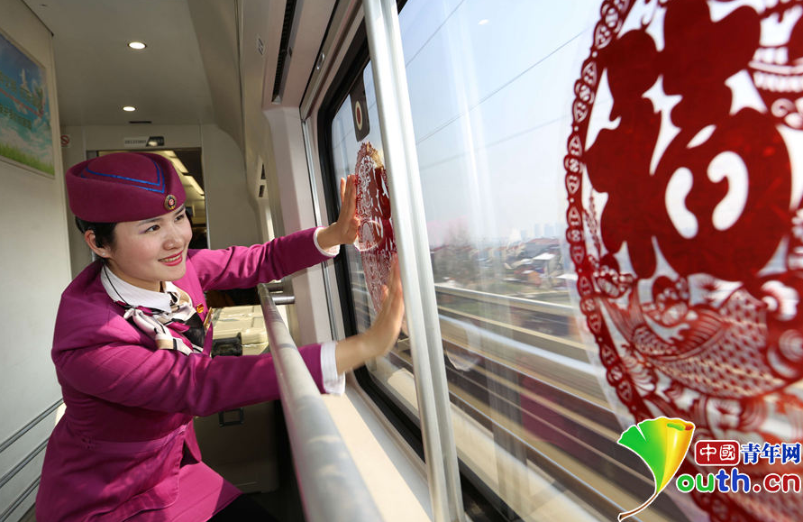 【网络媒体走转改】高铁动姐亲手装点列车 年味十足温暖旅客回家路 (1/6)