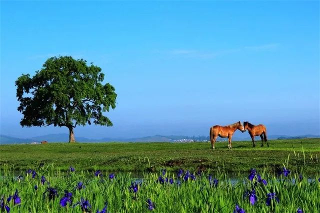 占地135公顷的草原,四周青山环绕,辽阔无涯,一碧千里。牛马悠闲觅食,各种色彩斑斓的花草灌木和水草依依的湿地风貌叫人移不开眼。