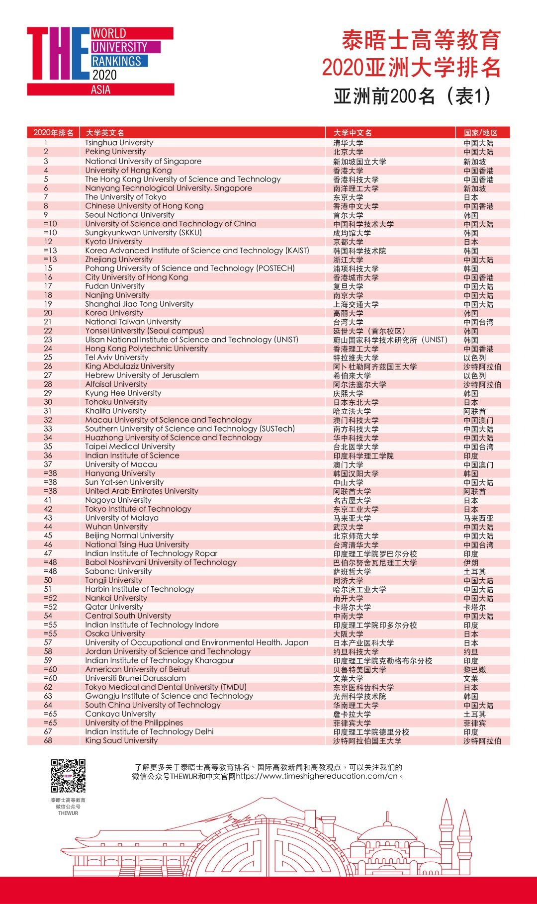 根据泰晤士高等教育2020亚洲大学排名,清华大学、北京大学、新加坡国立大学位居亚洲前三名。排名第四至第九名的大学分别为:香港大学、香港科技大学、南洋理工大学、东京大学、香港中文大学、首尔大学,中国科学技术大学、成均馆大学两所学校并列第十。