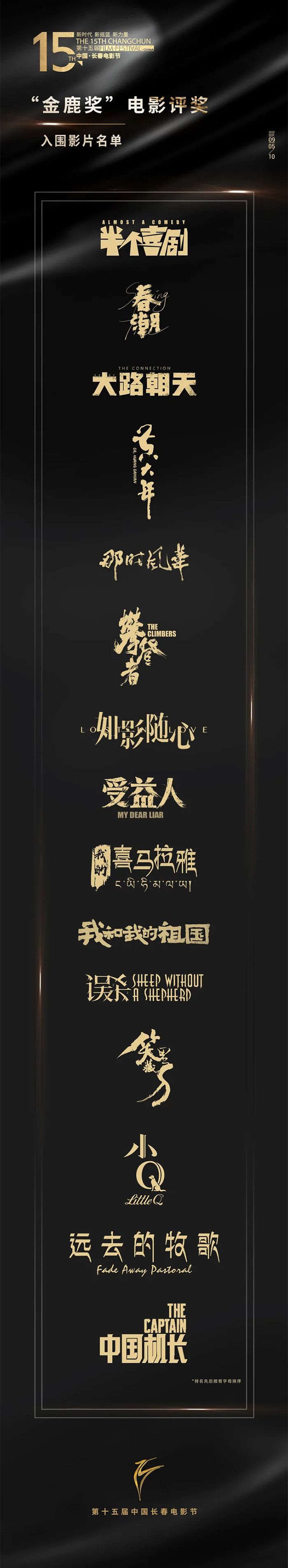 本届中国长春电影节“金鹿奖”将颁出最佳影片奖、评委会大奖、最佳导演奖、最佳男演员奖、最佳女演员奖、最佳编剧奖、最佳摄影奖、最佳音乐奖、最佳技术奖、最佳处女作奖等十项大奖,让我们一同期待以上15部入围影片的精彩亮相!