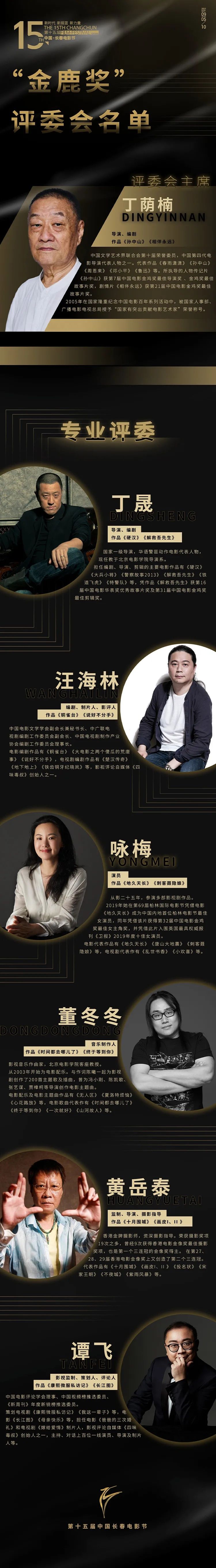 与此同时,万众期待的第15中国长春电影节“金鹿奖”评委会主席及评审团成员名单,也于当日公布。由导演丁荫楠担任本届“金鹿奖”评审主席,由导演丁晟、编剧汪海林、演员咏梅、音乐制作人董冬冬、摄影师黄岳泰、影评人谭飞共同担任专业评委。