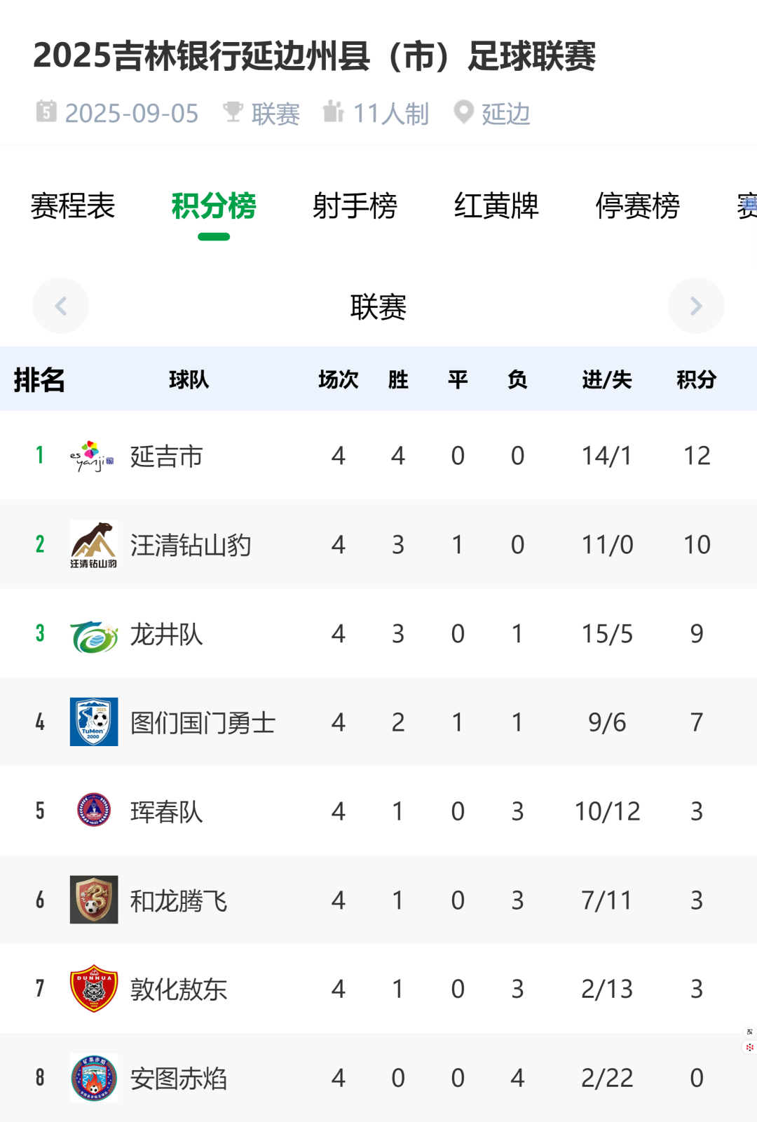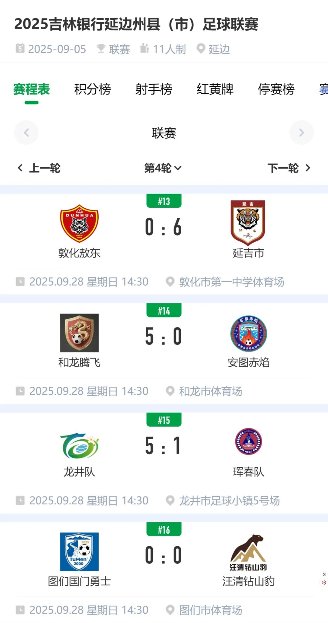 注:在第三轮比赛当中,因和龙腾飞队未经报名程序确认的运动员参与比赛,组委会纪律委员会根据《中国足球协会纪律准则》,对和龙腾飞队给予警告,并判罚0:3负于汪清钻山豹队。