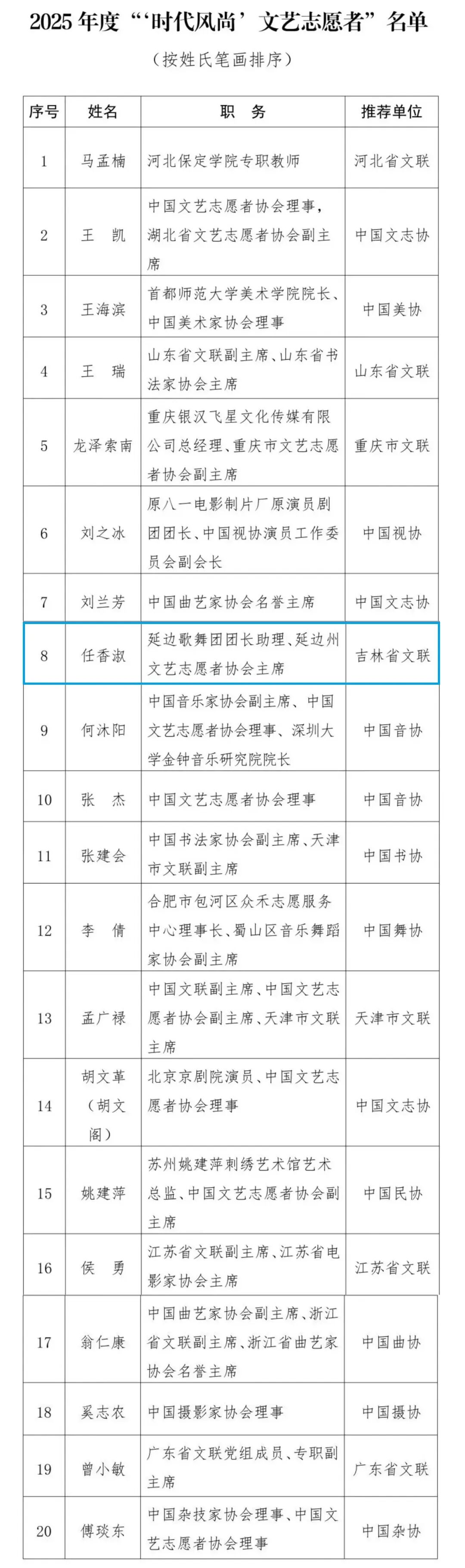 经中国文联各团体会员推荐、专家推选、社会公示等环节,推选出2025年度“时代风尚”文艺志愿者20人,并于10月11日公布,我州任香淑获评。