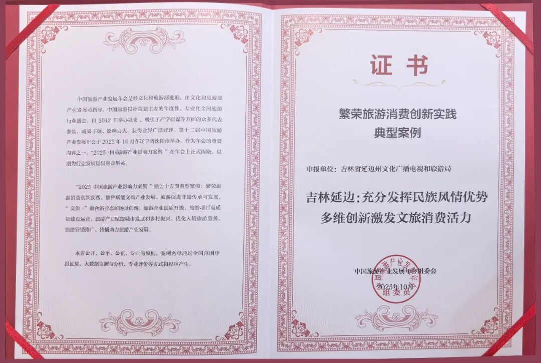 本次年会通过研讨交流、年度发布、推介洽谈等环节,总结“十四五”文化和旅游业发展经验和亮点,展望“十五五”文化和旅游发展新机遇、新挑战,为产业融合、行业交流、企业合作搭建平台、拓展空间,助推旅游业高质量发展。会上发布了2025中国旅游产业影响力案例评选结果,由延边州文化广播电视和旅游局报送的《吉林延边:充分发挥民族风情优势多维创新激发消费活力》上榜繁荣旅游消费创新实践典型案例。