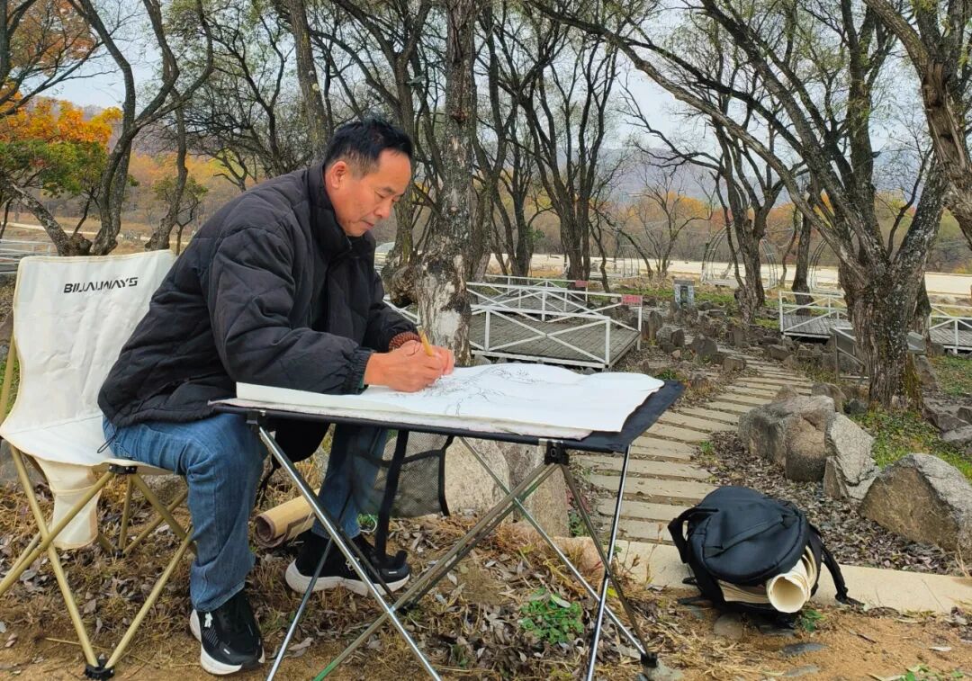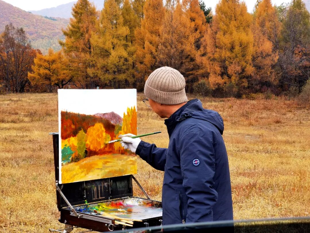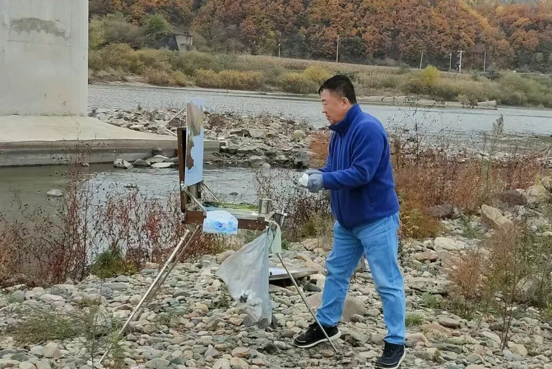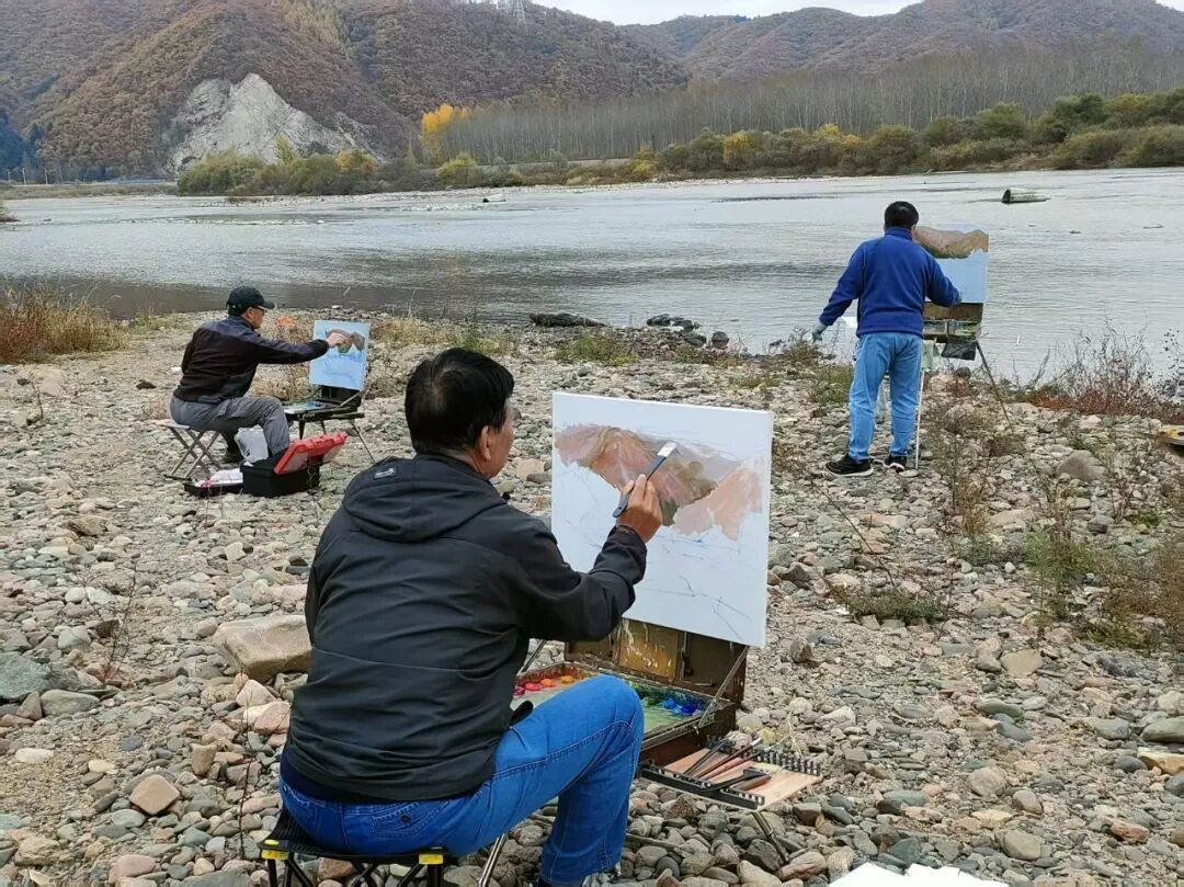 除了水南村的乡村景致,图们江畔的两岸风光同样让画家们沉醉。站在江畔,一侧是延边的层峦叠嶂,漫山遍野的树木褪去翠绿,换上红、黄、橙等绚烂的秋装,如同大自然打翻的调色盘;另一侧是邻国的异国风情,江风拂过,带来别样的景致与气息。画家们将两岸风光独特的融合在作品中,每一笔都饱含着对这片土地的热爱与赞美。