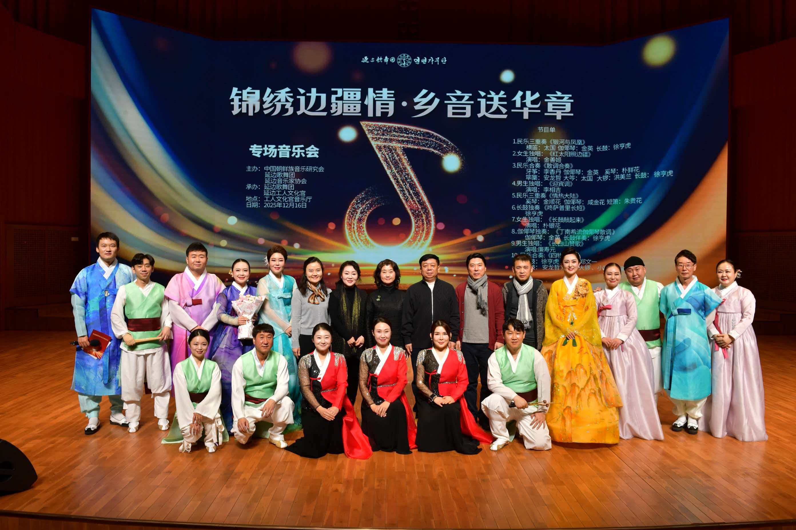 本次音乐会由中国朝鲜族音乐研究会、延边歌舞团、延边音乐家协会联合主办,是中国朝鲜族音乐研究会第七次会员代表大会换届后的首次年终盛会。整场演出涵盖民乐合奏、男女声独唱、长鼓演奏等多种形式,演绎了《红太阳照边疆》《长鼓敲起来》《长白山赞歌》等经典曲目。此次音乐会以音乐为纽带,抒发了对祖国的热爱与对民族的深情,进一步促进了各民族文化的交流与融合。