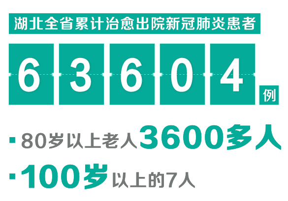 截至4月26日,湖北全省累计治愈出院新冠肺炎患者63604例,其中,80岁以上老人3600多人,100岁以上的7人。