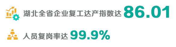 从3月11日至5月17日,湖北全省企业复工达产指数达86.01,基本与全国同步;全省5874个亿元以上续建项目应复尽复,截至5月18日,人员复岗率达99.9%。