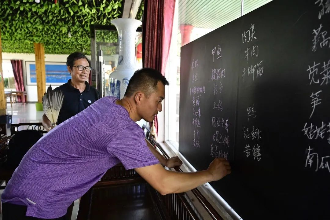 2020年 6月16日,在江西省余干县田园鄱阳湖景区,上岸渔民朱义才(左)在自己开办的农家乐内和儿子一起写当日的菜谱。(新华社记者 彭昭之 摄)
