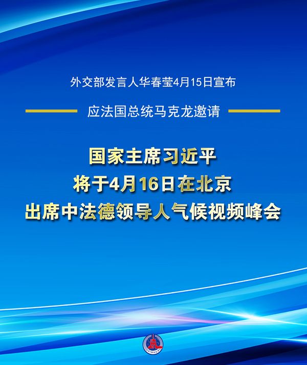 外交部发言人华春莹15日宣布:应法国总统马克龙邀请,国家主席习近平将于4月16日在北京出席中法德领导人气候视频峰会。