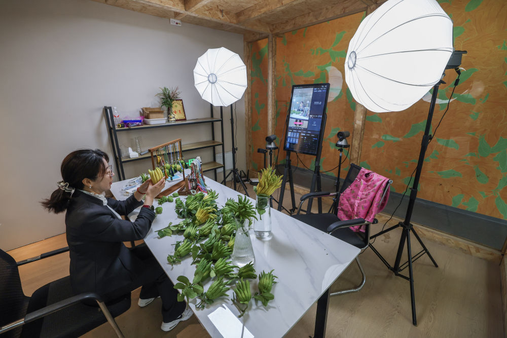 在浙江金华市金东区赤松镇北山口村的金华佛手农林服务中心内的直播间,工作人员进行佛手鲜果及衍生产品的直播销售(2025年10月22日摄)。新华社记者徐昱摄