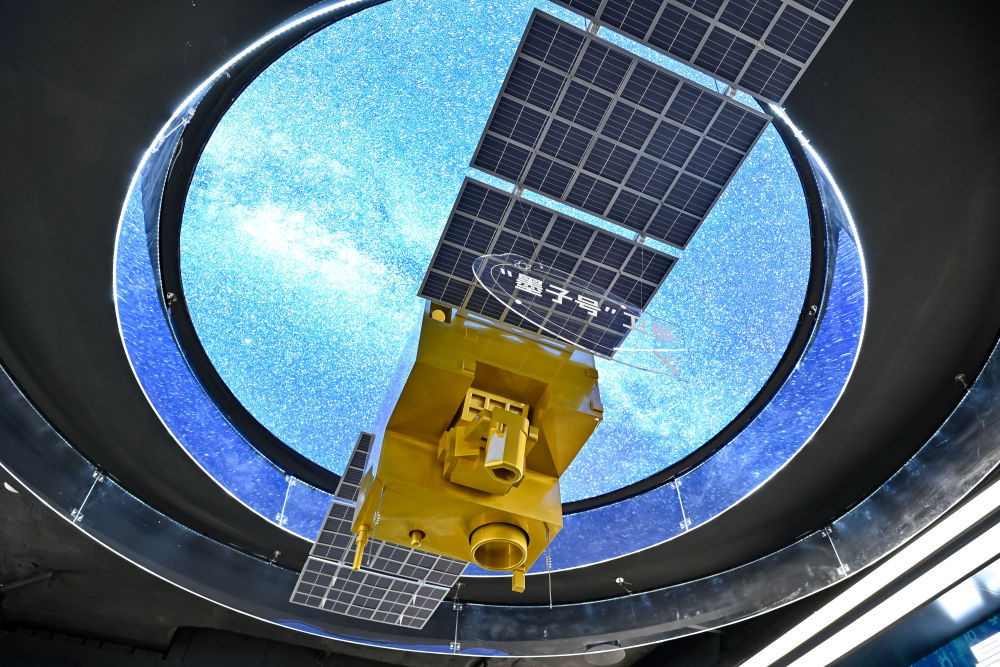 在位于安徽省合肥市的中电信量子信息科技集团有限公司科技体验馆内拍摄的“墨子号”量子卫星模型(2025年7月1日摄)。新华社记者张铖摄